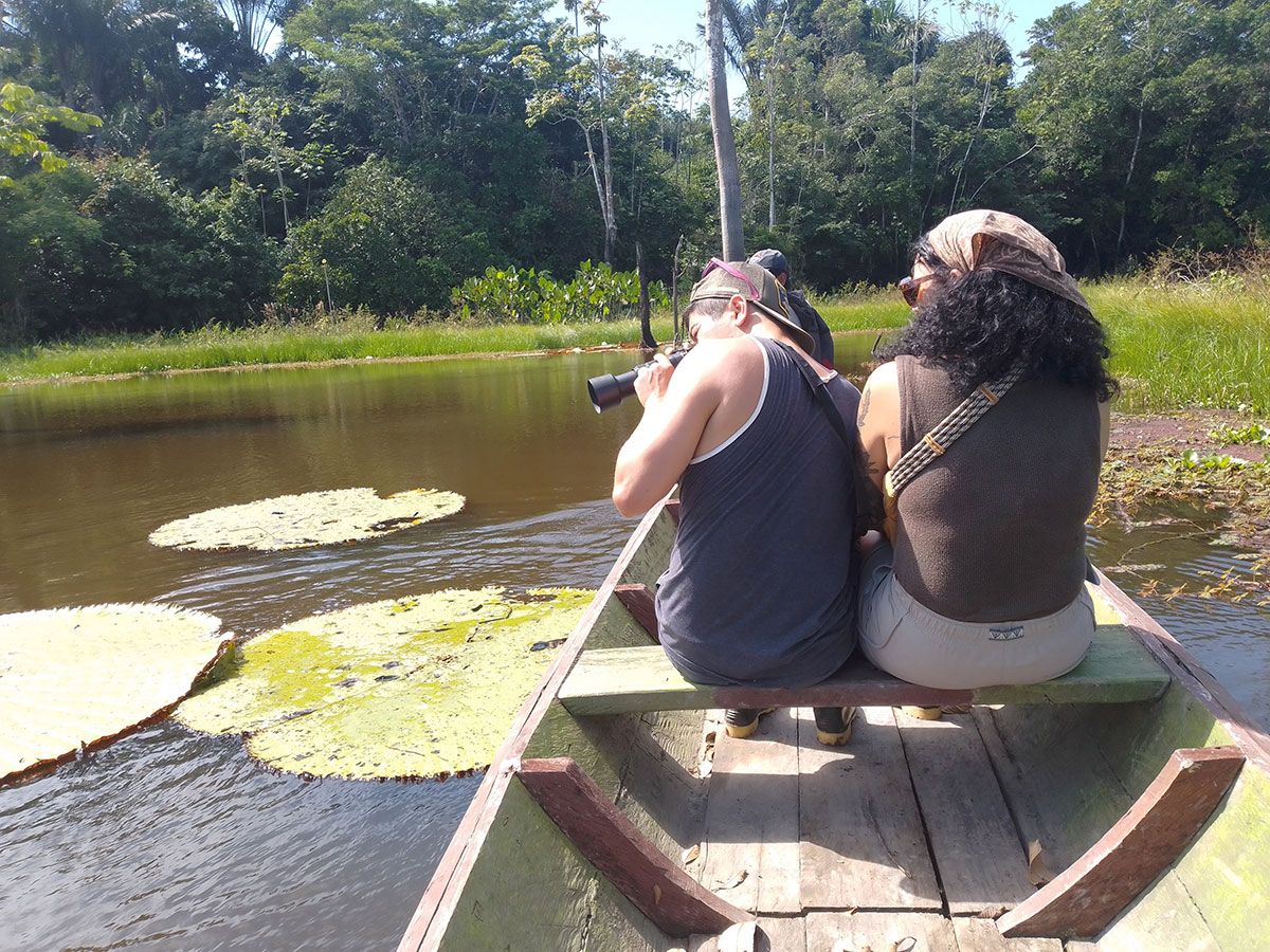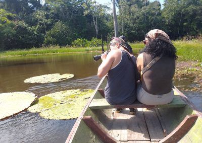 Alistaremos nuestros equipos para dirigirnos a navegar en bote abierto a un lago de aguas negras. Estos lagos se cubren a menudo con Victorias Regia gigantes, y muchas veces se podrá ver otras especies de aves, como Garzas, camungos, tucanes, etc. - 1:00 P.M. HORA DEL ALMUERZO.